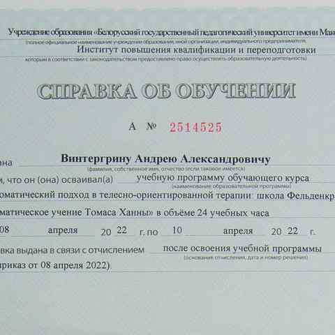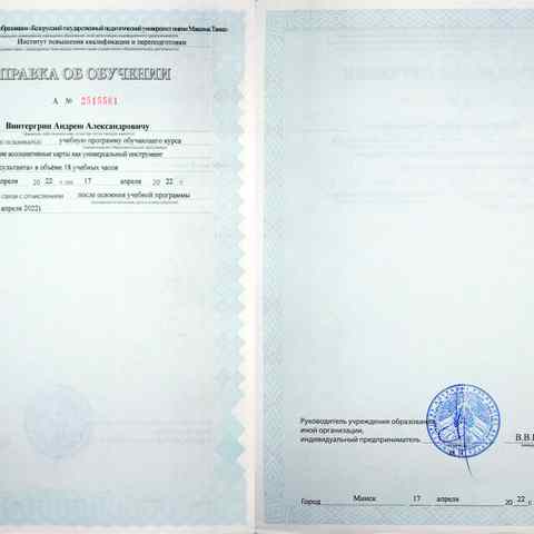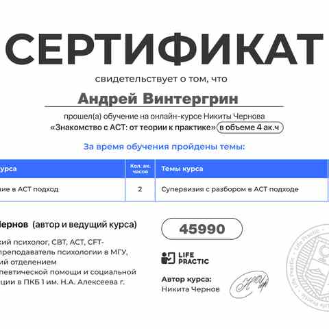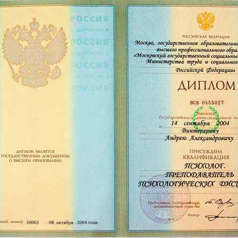 Высшее образование: Андрей Винтергрин получил образование в 2024 году, завершив обучение на факультете психологии Московского государственного социального университета по очной форме. Его квалификация включает специализацию «психолог, преподаватель психологических дисциплин». Специалист регулярно участвует в программах профессионального развития и дополнительного образования.